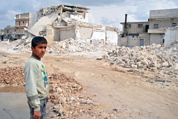 A young boy stands by the remains of a recent scud missile attack in the neighbourhood of Tariq al-Bab in Aleppo, Syria. Many homes in the area have been completely destroyed by government shelling. Aleppo, SYRIA – 11/4/ 2013. Credit: Ali Mustafa/SIPA Press