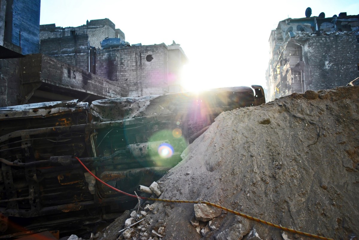 A truck is strategically positioned to shield Free Syrian Army fighters and any passers-by from sniper fire near the frontlines of battle in the neighbourhood of Bustan al-Basha in Aleppo, Syria. Many streets and alleyways in the city remain under constant threat of sniper fire by government forces. Aleppo, SYRIA – 11/4/ 2013. Credit: Ali Mustafa/SIPA Press
