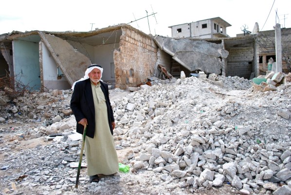 An elderly man stands by the ruins of his home after it was hit by a scud missile in Atareb, a small village located in the governate of Aleppo, Syria. The village has been under rebel control for nearly a year. Atareb, SYRIA – 30/3/2013. Credit: Ali Mustafa/SIPA Press