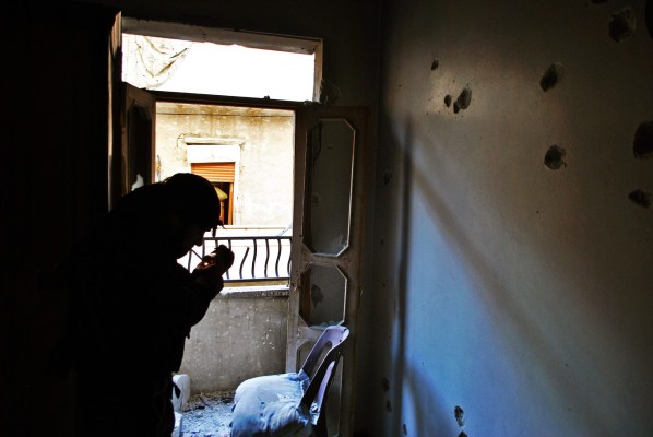 The walls of a building show signs of a recent battle between Free Syrian Army rebel fighters and government forces in the al-Ameriya neighbourhood of Aleppo, Syria. The building is used for cover by advancing Syrian rebel fighters. Aleppo, SYRIA – 29/4/2013. Credit: Ali Mustafa/SIPA Press